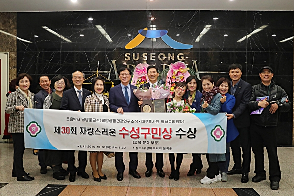 웰빙생활건강연구소 남병웅 대표(사회복지학 박사)가 지난 10월 31일 수성아트피아에서 개최된 제30회 자랑스러운 수성구민상 시상식에서 수성구민상(교육문화부문)을 수상했다.