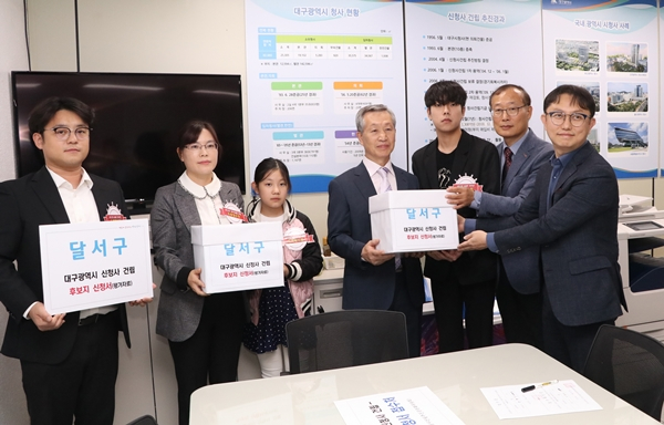 대구 달서구(구청장 이태훈)는 11월 6일 오후 4시 대구의 백년대계를 위한 소명과 60만 달서구민의 신청사 유치 열망을 담고 각계각층의 전문가의 검토와 자문을 거쳐 완성한 대구광역시 신청사 건립 후보지 신청서를 구민대표 4명이 직접 접수하였다.