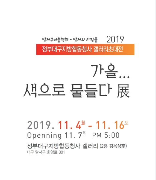 대구 달서구(구청장 이태훈)는 달서구미술협의회(회장 추영태)가 11월 4일부터 11월 16일까지 2주간 정부대구지방합동청사를 방문하는 지역민과 직원에게 문화를 향유할 수 있는 기회를 제공하기 위해 ‘달서구미술협의회 우수작가 초청 전시회’를 개최한다고 밝혔다.