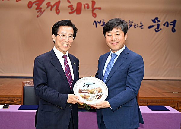 | ↑↑ 지난 11월 6일 자매결연 체결후 고윦롼 문경시장(왼쪽)과 황명선 논산시장이 포즈를 취하고 있다. |