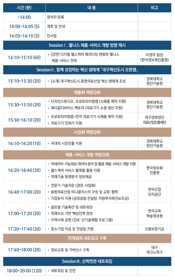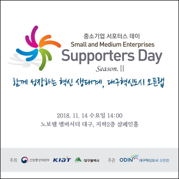 산업통상자원부, KIAT, 대구광역시가 주최하고 대구혁신도시 오픈랩이 주관으로 대구지역 중소기업의 혁신성장과 발전을 위해 제공되는 정부지원 사업과 지원 방압을 소개하는 "중소기업 서포터스 데이 시즌 2"가 11월 14일 수요일 노보텔 앰배서더 대구 지하 2층 샴페인 홀에서 대구지역 중소기업 대표자 및 담당자 등을 대상으로 열린다.