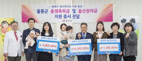 울릉군은 2018년 12월 울릉군 출산장려금 등 지원에 관한 조례 개정을 통해, 2019년부터 아이를 낳은 가정에 대해서 출산장려금을 첫째아 340만원에서 680만원으로, 둘째아 580만원에서 1,160만원, 셋째아 820만원에서 2,600만원으로 대폭 상향하여 지원해오고 있다.