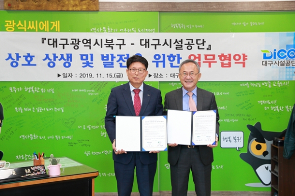 대구광역시 북구와 대구시설공단은 11월 15일(금) 오후 2시, 구청장 집무실에서 지역발전 협력네트워크 구축을 위한 상호 상생 및 발전을 위한 업무협약을 체결했다.