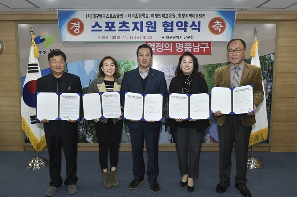 (사)대구남구스포츠클럽(회장 조재구)은 지난 15일, 미래인재교육원(주) 및 대덕초등학교, 한빛지역아동센터와 청소년 스포츠지원 업무 협약을 체결하였다.