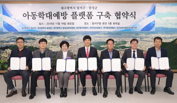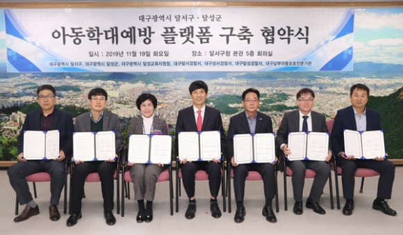 대구 달서구(구청장 이태훈)는 11월 19일 세계아동학대예방의 날을 맞이하여 달서구청 대구남부아동보호전문기관, 달성군청, 달서·성서·달성 경찰서, 달성교육지원청 7개 기관이 아동학대예방 플랫폼 구축을 위한 협약을 체결하였다.