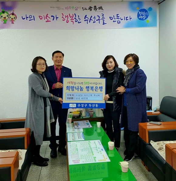 수성구 수성SK리더스뷰아파트 부녀회(회장 강미하)는 지난 6일 두산동 행정복지센터를 방문하여 주위의 어려운 이웃을 위해 써 달라며 사랑나눔 바자회 수익금 40만원을 전달했다.