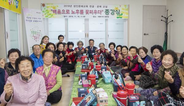 울릉군은 지난 11월 18일과 19일 양일에 걸쳐 태하1리 경로당과 현포1리 경로당에서 2019년 성인문해교육 종강식을 가졌다.