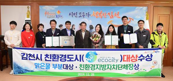 김천시(시장 김충섭)는 지난 11월 28일 한국환경정보연구센터 주최로 서울신용보증재단 대강당에서 열린‘제8회 친환경도시대상, 에코시티’에서 맑은물 부문대상과 함께 에코시티 종합대상, 친환경지방자치단체장상도 함께 수상하며 올해의 친환경도시로 선정되는 영예를 안았다.