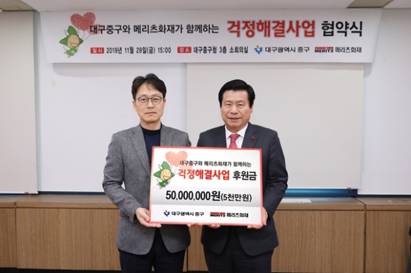 대구시 중구(구청장 류규하)는 11월 29일(금) 중구청 3층 회의실에서 ㈜메리츠화재해상보험(대표이사 김용범)과 ‘걱정해결사업 협약식’을 가졌다.