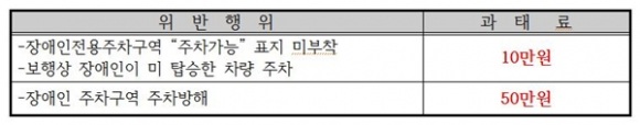 장애인 주차구역 위반행위의 과태료는 다음과 같다.