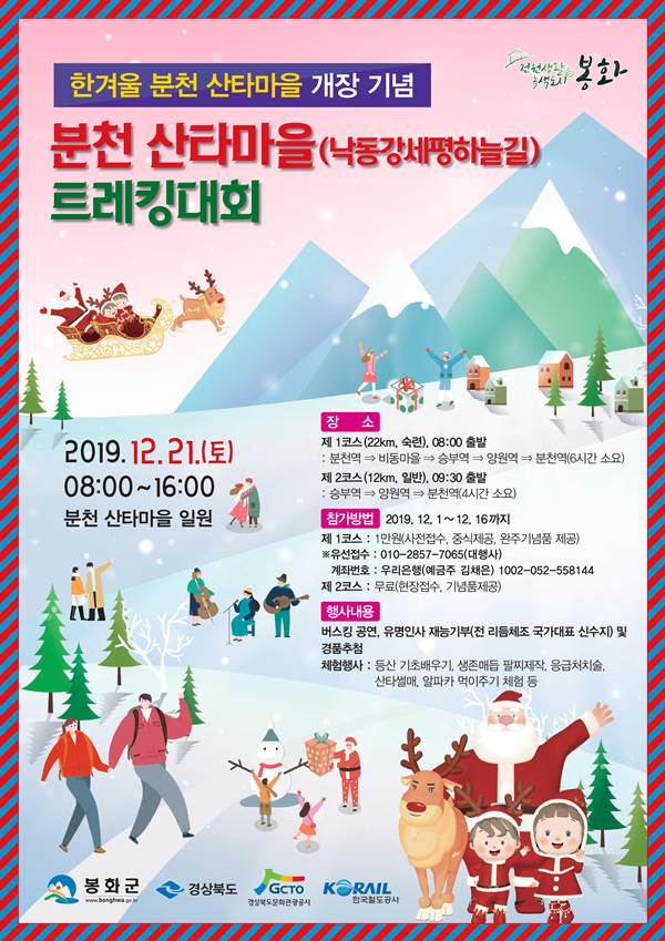 봉화군(군수 엄태항)은 오는 12월 21일(토) 분천산타마을과 낙동강세평하늘길 일대에서 『분천산타마을 트레킹대회』를 개최한다. 한겨울 분천산타마을 개장에 맞춘 이번 트레킹대회는 백두대간 협곡열차와 분천산타마을, 낙동강세평하늘길을 연계하여, 산타마을을 방문한 관광객들에게 이색체험을 제공하고자 기획되었다.