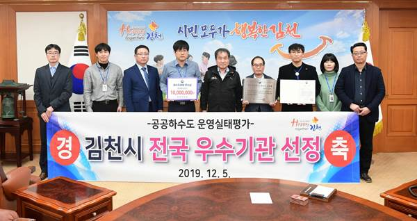 김천시는 환경부에서 전국 160개 지자체를 대상으로 실시한 “2019년도 공공하수도 운영·관리 실태평가”우수기관으로 선정되어 지난 12월 5일 환경부로부터 인증패와 시상금 1천만원을 수상하였다.