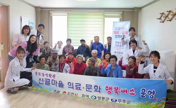 김천시는 삼도봉생활권 산골마을 의료‧문화 행복버스 사업을 지난 1월 김천시 대덕면 관기리 경로당을 시작으로 한해동안 경북 김천시, 충북 영동군, 전북 무주군에서 의료‧문화 서비스를 통합하여 총 120회 제공하였다.