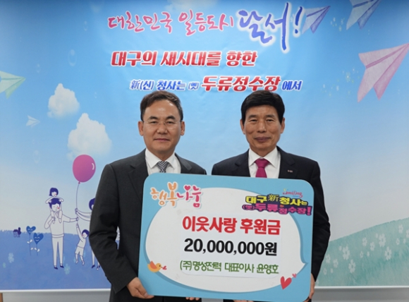 대구 달서구(구청장 이태훈)는 ㈜명성전력 윤영호 대표이사가 지난 17일 연말을 맞아 동절기 저소득취약계층을 지원해 달라며 이웃사랑 후원금 2,000만 원을 기탁했다고 밝혔다.