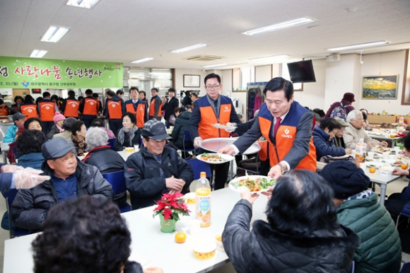 대구시 중구(구청장 류규하)는 23일(월) 오전 11시에 남산기독교종합사회복지관에서 5급 이상 간부공무원 40여 명이 관내 어르신 200여 명을 대상으로 ‘사랑나눔 무료급식 송년행사’를 개최했다.