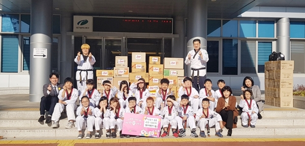 | ↑↑ 점프태권스쿨(고성동 소재)관장과 학원생이 자발적으로 모은 라면 1000개를 기부 |