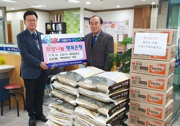 수성구 수성1가동 새마을금고(이사장 이재윤)는 1월 7일 어려운 이웃을 위해 써달라며 수성1가동 행정복지센터에 백미 20kg 18포(100만 원 상당)를 전달했다.