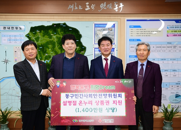 동구민간사회안전망위원회(위원장 김재문)은 지난 7일 민족 고유의 명절 설을 맞아 취약계층 지원을 위해 1,400만 원 상당의 온누리상품권을 동구청에 전달했다.