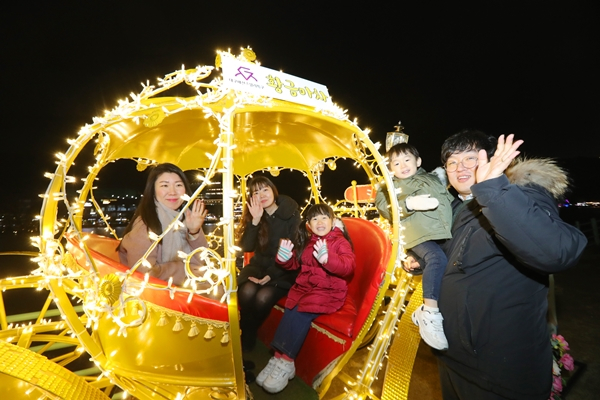 | ↑↑ 수성빛예술제의 황금마차 포토존에서 기념촬영을 하고 있다. |