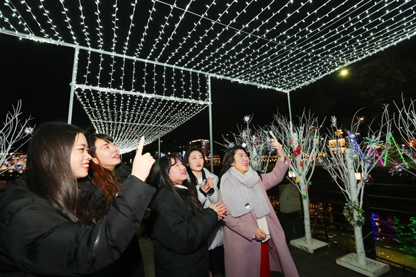 겨울밤을 밝히고 있는 수성빛예술제를 즐기기 위해 가족과 연인들은 저마다 인증샷을 찍으며 즐거워하고 있다.
