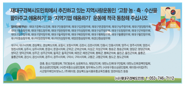 재대구경북시도민회에서 추진하고 있는 「지역사랑운동」인 ‘고향 농•축•수산물 팔아주고 애용하기’와 ‘지역기업 애용하기’ 운동에 적극 동참하고 있는 참여단체 입니다.