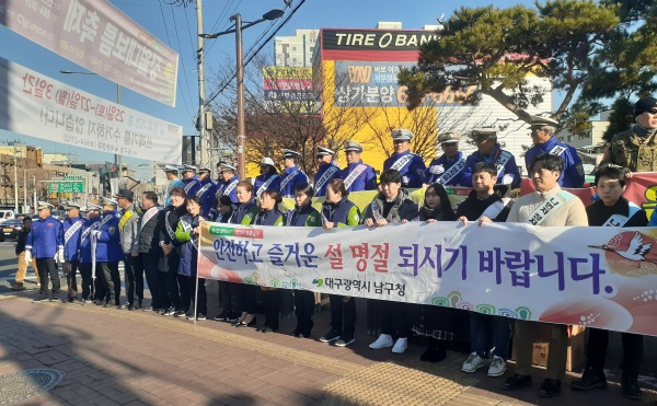 대구광역시 남구청(구청장 조재구)은 지난 21일(화), 고속도로 이용객이 늘어나는 설 연휴를 맞아 서부시외버스터미널 주변에서 ‘설맞이 교통사고 줄이기 캠페인’을 펼쳤다.