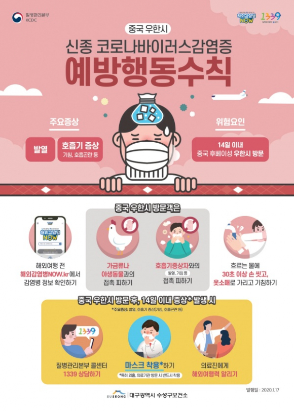 또한 수성구청 홈페이지, 블로그, SNS 등을 통한 예방수칙을 안내하고 있으며, 포스트 및 안내문을 제작해 어린이집, 유치원, 경로당 등에 배부해 신종 코로나바이러스 감염 예방 홍보활동을 강화하고 있다.
