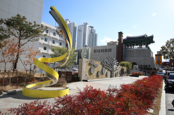 동부교육지원청 북편담장에는 근대기부문화를 기념하는 디자인 담장을 설치하여 어두운 골목을 다듬어 환경을 개선하고 관광객들에게 볼거리를 제공할 뿐만 아니라 근대 우리지역의 나눔을 실천하신 분의 뜻을 기리는 의미있는 공간으로 재탄생 시켰다.