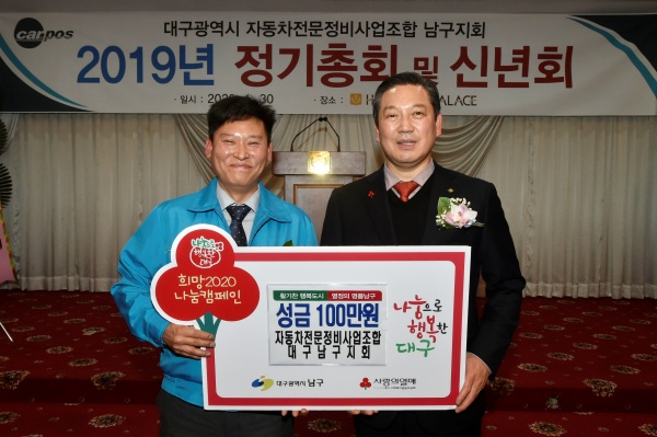 이날 대구자동차전문정비사업조합 남구지회는 호텔 더 팔래스에서 지회장 이·취임식 및 신년회를 개최하고, 회원 120여 명과 함께 어려운 이웃에게 도움이 되기를 바라는 마음을 담아 성금을 전달하였다.