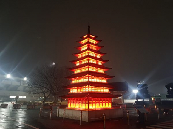 경주시는 시민의 숲인 황성공원 시민운동장 입구에 설치된 조형물 ‘황룡사9층목탑’에 LED 조명을 설치했다.