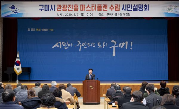 구미시(시장 장세용)는 지난 2월 7일 10:00 시청 4층 대강당에서 김세환 부시장과 관광 관련 종사자 및 단체, 시민 등 150여 명이 참석한 가운데 「구미시 관광진흥 마스터플랜 수립」시민설명회를 열었다.