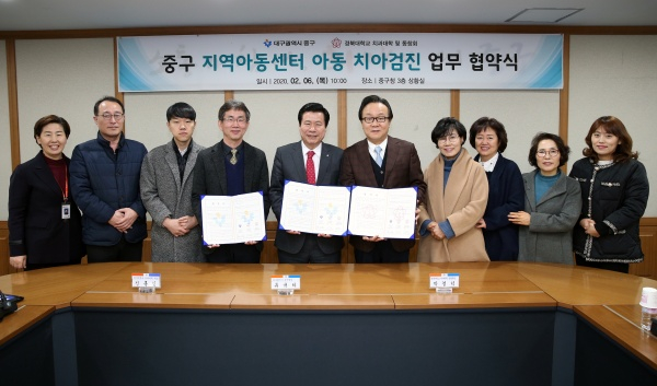 대구시 중구(구청장 류규하)는 6일(목) 오전 10시 구청 3층 상황실에서 경북대학교 치과대학 및 치과대학 동창회와 '지역아동센터 치아건강검진 협약식'을 가졌다.