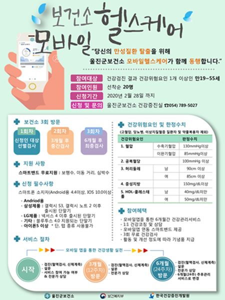 친절 울진군 보건소(소장 최용팔)에서는 오는 2월 28일까지 2019년도 모바일 헬스케어 사업 참여자 20명을 추가 모집한다.