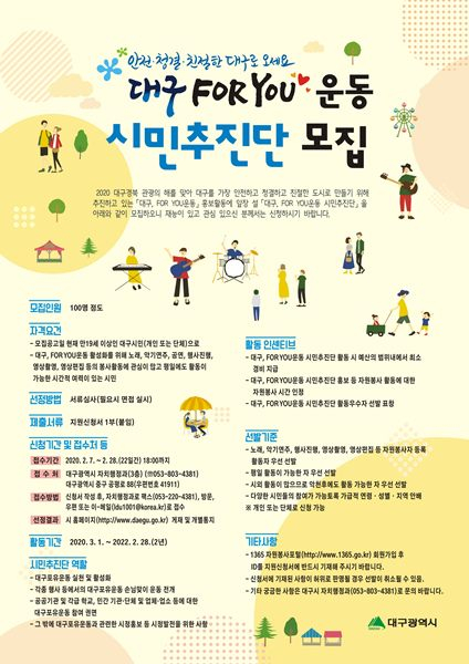 대구시는 ‘2020 대구경북 관광의 해’를 맞아, 대구를 전국에서 가장 안전하고 청결하고 친절한 도시 이미지를 만들기 위해 지난해부터 범시민운동으로 추진하고 있는 ‘대구, FOR YOU운동’과 대구시를 함께 홍보할 시민추진단을 모집한다.